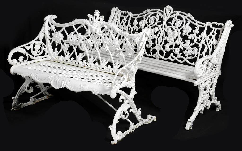 A white painted cast iron bench in Coalbrookdale style, decorated with a grape vine and leaf scrolls, 86cm high, 106cm wide, 59.5cm deep, together with a cast aluminium garden bench naturalistically decorated and with a wooden slatted seat, 86cm high, 129.2cm wide, 58.3cm deep. (2)