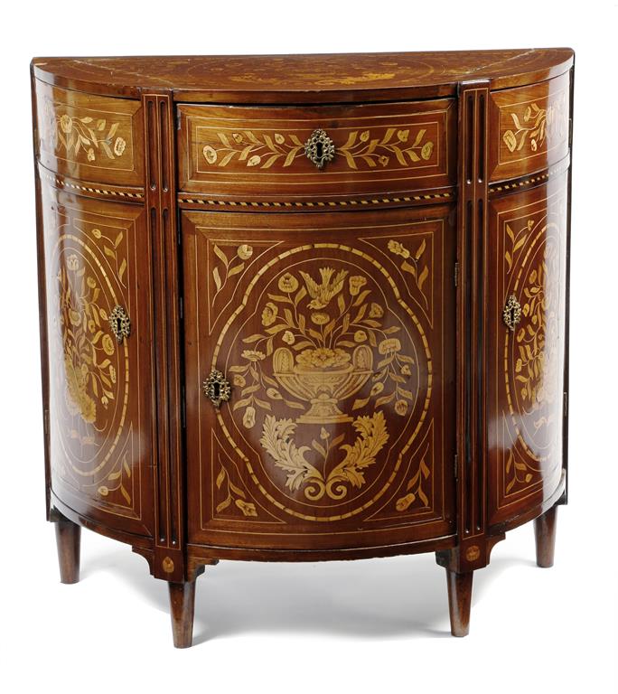A 19th century Dutch mahogany and marquetry demi-lune commode, inlaid with urns of flowers, leaves and birds, with a central frieze drawer above a cupboard door (locked), flanked by two further doors, 79.5cm high, 79cm wide, 38.1cm deep.