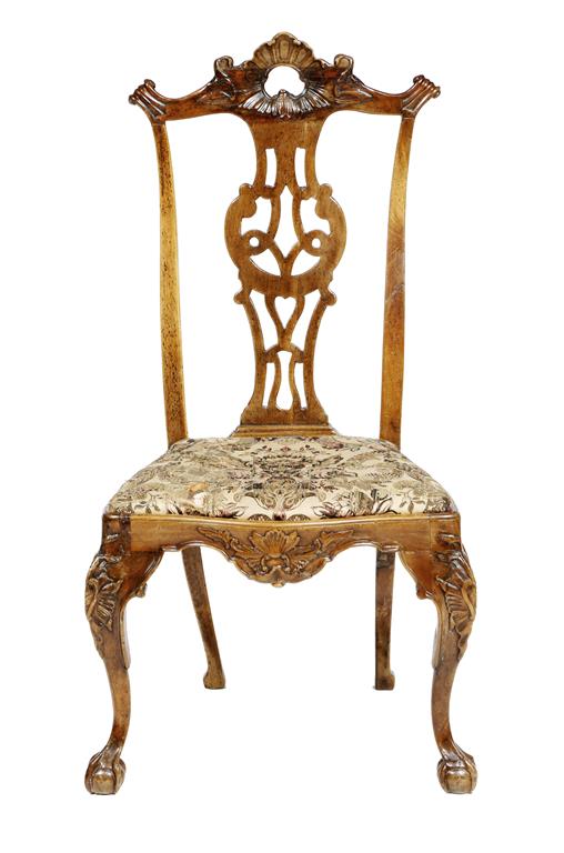 An 18th century Dutch walnut side chair, carved with scrolls and rocaille, the pierced splat above a drop-in seat, on cabriole legs ad claw and ball feet.