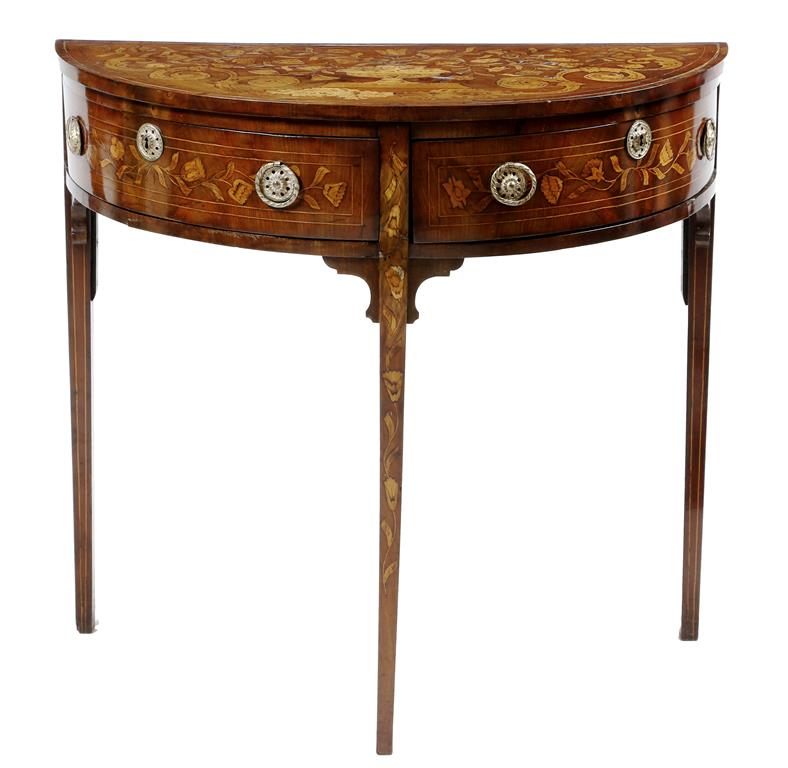 A Dutch mahogany and marquetry demi-lune side table, inlaid with an urn, leaves and flowers, with a pair of segmented frieze drawers, on square tapering legs, late 18th / early 19th century, 77cm high, 82.5cm wide, 41cm deep.