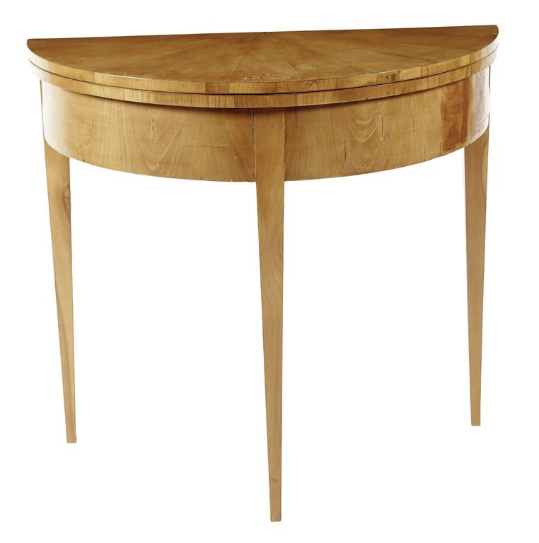 An early 19th century demi-lune Biedermeier cherrywood tea table, the segmented hinged fold-over top supported by a single pull-out leg, with a compartment, 78.3cm high, 86.7cm wide, 43.7cm deep.