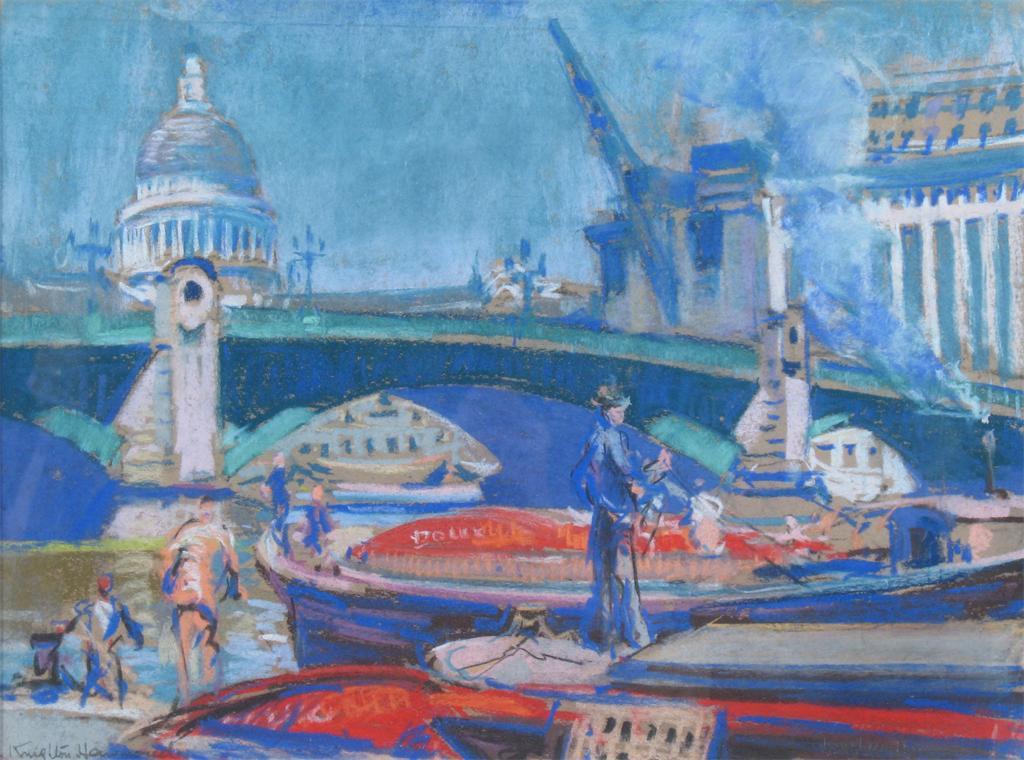 ARTHUR HENRY KNIGHTON HAMMOND (1875-1970): London barges with St Paul's beyond, signed, pastel, 33 x 44.5cm (13 x 17.5in) ++ Good