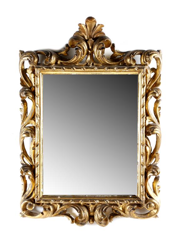 A late 19th century Italian Florentine giltwood wall mirror, the rectangular plate within a scroll carved frame, the reverse with a metal inventory plaque numbered 'LK5172', 51 x 35cm.