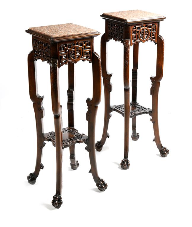 Gabriel Viardot (French 1830-1906). A near pair of French stained beechwood 'Japonais' jardinière stands, each with a pink marble inset top above a pierced frieze with oriental symbols, on scroll legs and claw and ball feet, both stamped 'G. Viardot', 101cm high, 32.5cm square. (2)