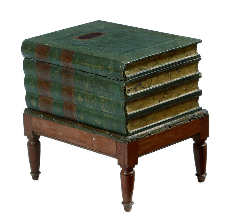 A 19th century French painted wood and leather faux book occasional table, the hinged top revealing a marbled paper part lined interior, with a lidded compartment on turned legs, 45.5cm high, 44.5cm wide, 35.7cm deep.