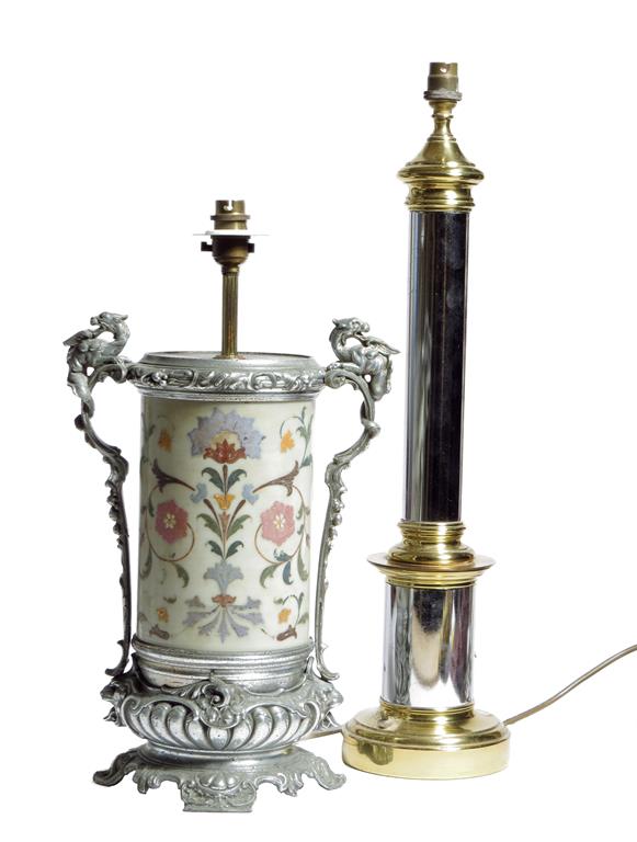 A German table lamp, the body painted with flowers and with silvered metal mounts in the Renaissance revival style, together with a brass and silvered metal table lamp, 57.8cm high (max). (2)