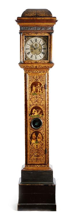 An early 18th century and later walnut marquetry longcase clock, the eight day five ringed pillar movement with a latched centre pillar, with an inside locking plate and striking on a bell, the 11 inch brass dial signed 'Peter Wise, London' on the silvered chapter ring, the matted centre with subsidiary seconds and date aperture, ringed winding holes, winged mask and scrolled spandrels, in a case with panelled sides, the hood with a caddy top and ball finials, the whole inlaid with scrolled marquetry, the trunk door with two panels of hunting scenes, the lower panel beneath the glass lenticle decorated with shepherds, now with a later ebonised plinth, 239cm high.