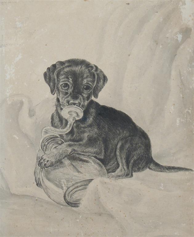 EDMUND CALDWELL (1852-1930): A pen and ink sketch of a puppy holding a dummy in its mouth
