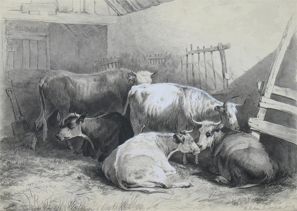MARY PORTER (19th century): Four pen and ink sketches of cattle and sheep, after Thomas Sydney Cooper (4) Mary Porter attended Coopers 'drawing classes for ladies' at Canterbury ++ One with two tears to edge.
