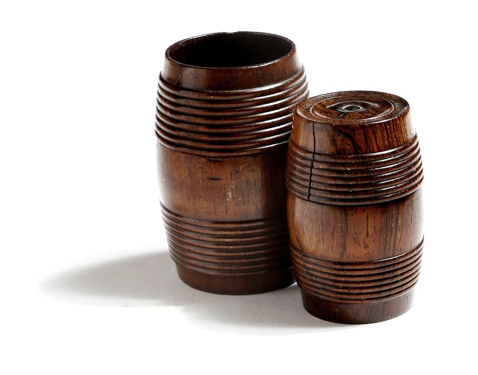 λ Treen. An early Victorian turned rosewood travelling barrel inkwell and sander, each with reeded bands, the upper barrel inkwell with a spring loaded ink bottle to prevent spillage, stamped 'A. B.', the sander with a screw-off top, 13cm high. (2)