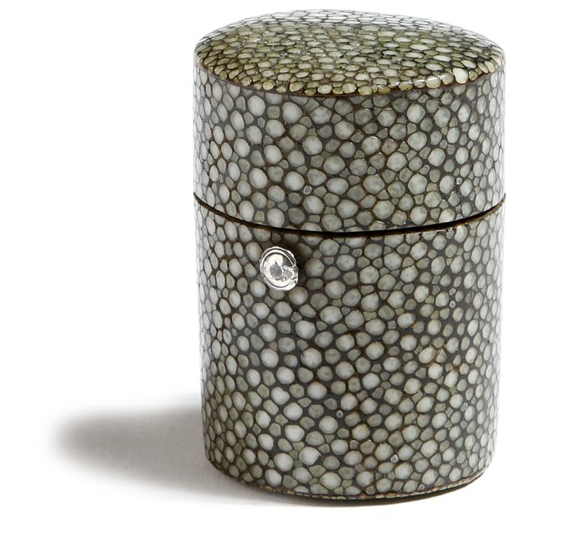 A George III shagreen travelling inkwell, the hinged spring release lid revealing a glass bottle and stopper, 6.2cm high.
