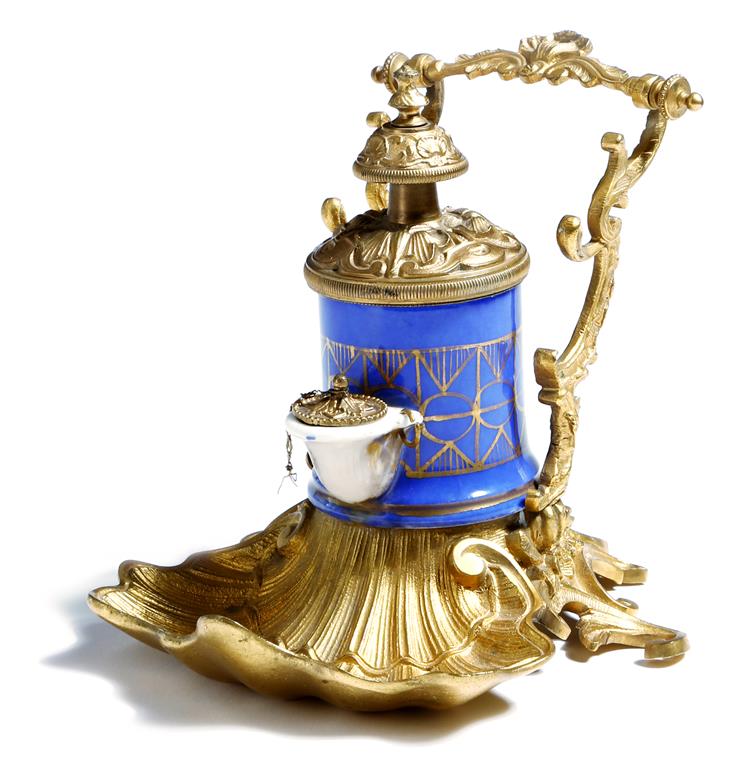 A 19th century French ormolu and porcelain inkstand, with a displacement pump ink cistern, the handle with pen rests, above a shell and scroll base, 15.3cm high, 15.5cm wide, 17.7cm deep.
