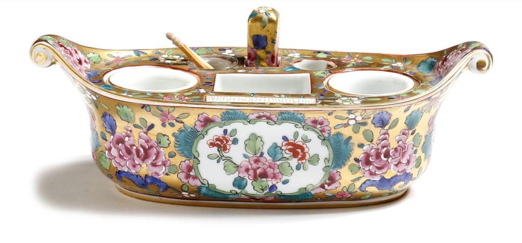 A continental porcelain navette shape inkstand, with scroll handles, painted with enamel flowers and leaves on a gilt ground, with a pair of lift-out inkwells, a matching seal, a striker plate for vestas and three other apertures, 21.3cm wide.