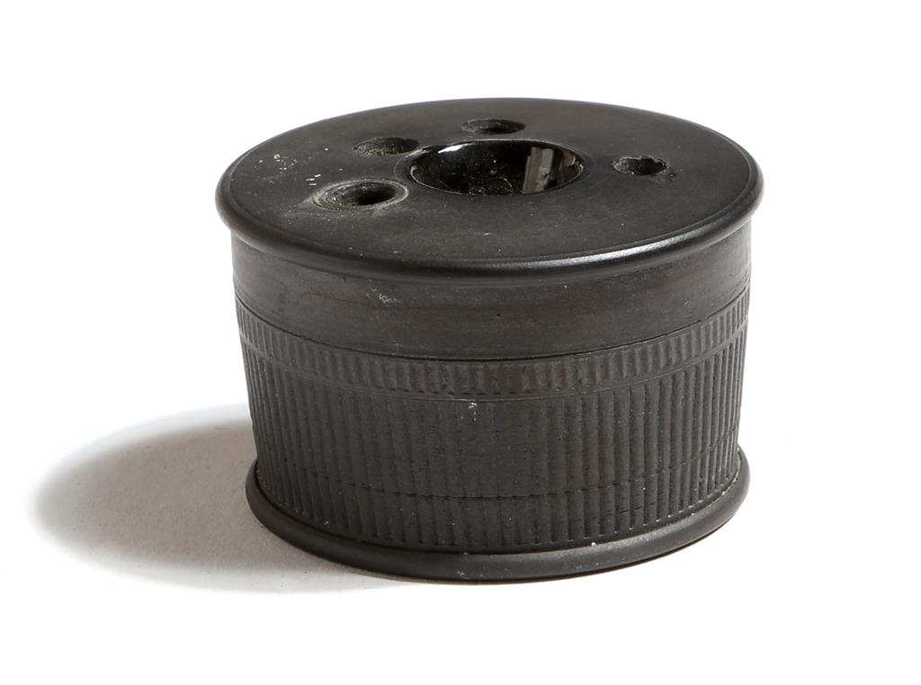 A 19th century black basalt pottery inkwell, with five apertures for pens and quills, with a fluted body, 6cm diameter.