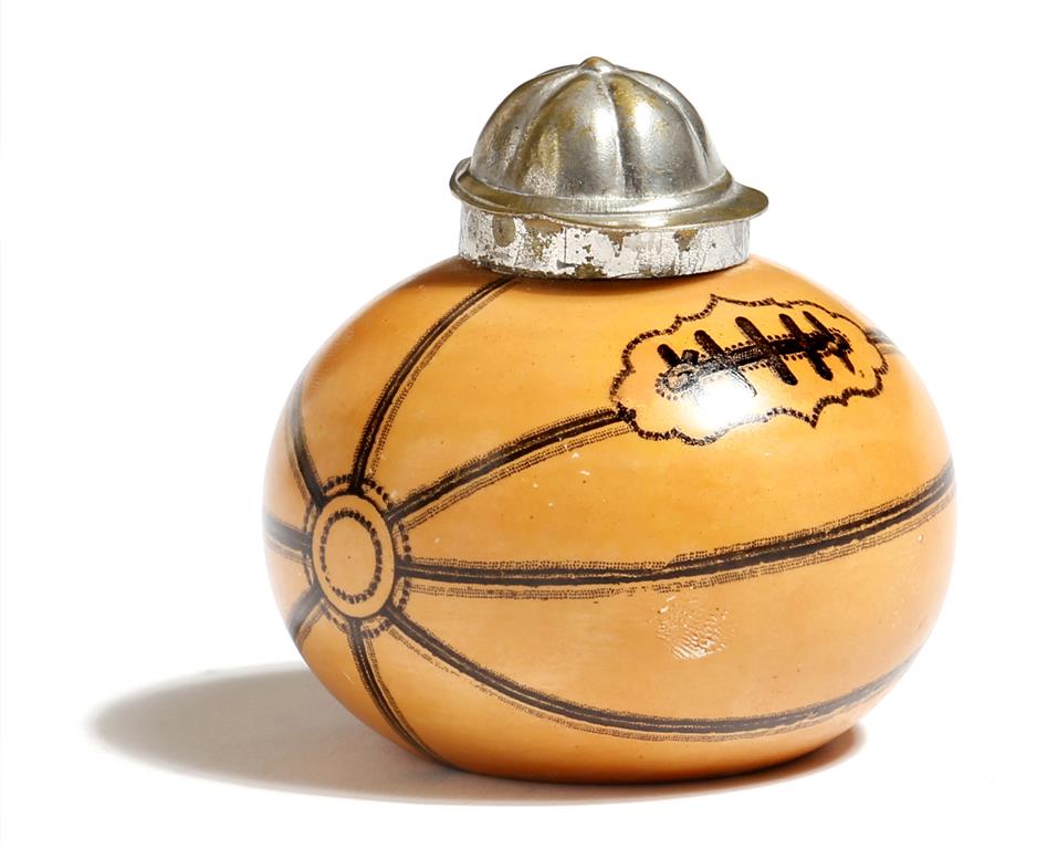 A novelty pottery inkwell in the form of a rugby ball, with a hinged gilt metal lid in the form of a cap, the base with the registration number '167875', first registered in 1891, late 19th / early 20th century, 7.5cm wide.