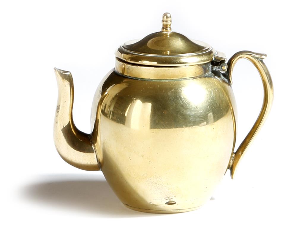 A late Victorian novelty brass inkwell in the form of a teapot, the hinged lid revealing a glass liner, the brass rim inscribed 'STOCKLEY 44 NEW BOND ST LONDON', 9.1cm wide.