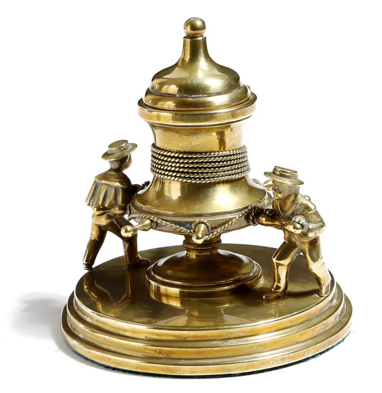 A late Victorian brass nautical inkstand, modelled with two sailors winding rope on a capstan, with a hinged lid, 15.2cm high, 14.6cm diameter.