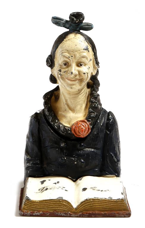 A cold painted metal inkwell modelled as the famous music hall comedian Dan Leno, as a pantomime dame, the hinged lid revealing a ceramic well, supporting a book inscribed 'DAN LENO', late 19th / early 20th century, 11.6cm high.