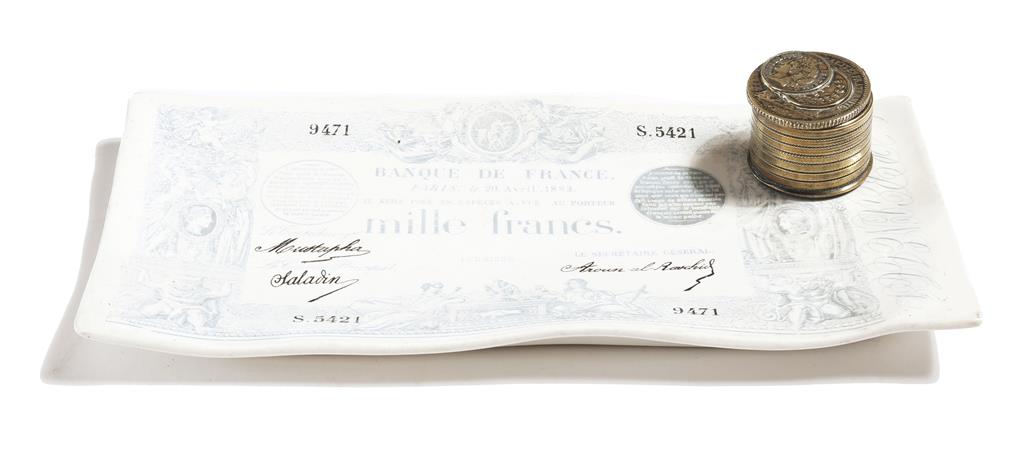 A French novelty porcelain inkstand, in the form of a thousand Francs note, the Banque de France officials ironically signed with Arabic names, Mustapha, Saladin and Aroun-Al-Raschid, mounted with a brass inkwell, the lid in the form of French coins, with a glass liner, the base with maker's mark 'G.D. Paris', late 19th century, 24.5cm wide.
