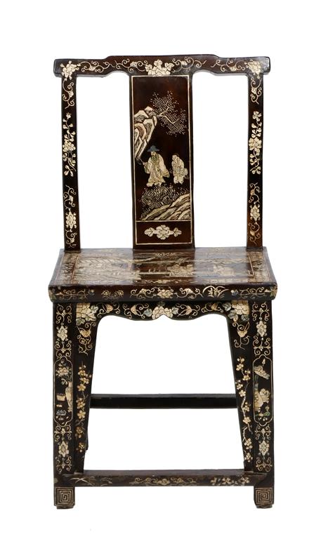 A Chinese coromandel lacquer side chair, decorated with panels of figures, urns of flowers, fruit and scrolling leaves and prunus blossom, late 19th century.