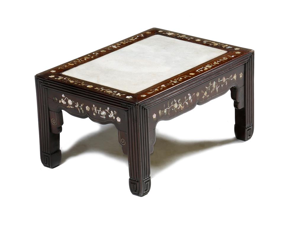A Chinese hardwood and mother of pearl stool, with a marble inset top and inlaid with leaves and flowers, on reeded scroll legs, late 19th century, 25.8cm high, 48.6cm wide, 35cm deep.
