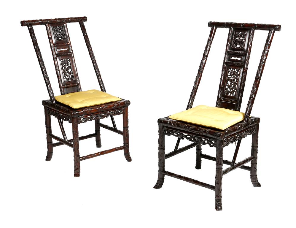 A pair of Chinese hardwood faux bamboo chairs, each carved with bamboo leaves, the pierced splat decorated with a Chinese shou symbol and a panel of prunus blossom, with a yellow silk squab cushion, late 19th century. (2)