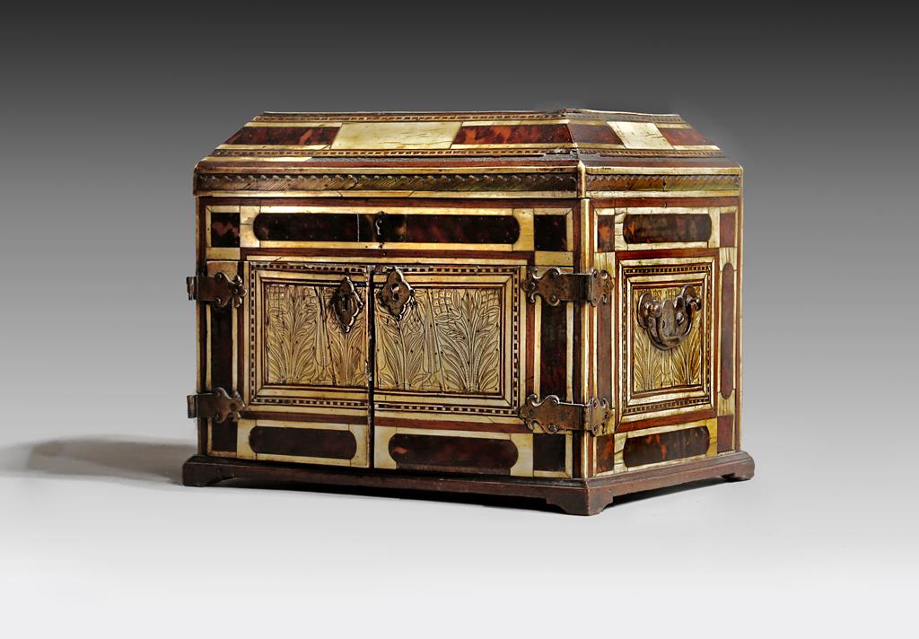 λ An Indo-Portuguese tortoiseshell and hardwood table cabinet, inlaid with bone and ivory stringing and with engraved ivory panels with leaves and flowers, the hinged lid revealing a mirror and a lift-out tray with four divisions, above a pair of doors revealing an arrangement of six drawers, each with a green stained bone and gilt fret front, with a pair of sliding panels to the back edge of the cabinet, revealing six secret drawers, with brass side carrying handles and hinges, early 18th century and later, 26.5cm high, 33cm wide, 24.2cm deep.