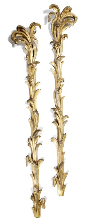 A pair of carved giltwood wall appliques, in the form of scrolling leaves, each with a brass suspension ring, 151cm high. (2)