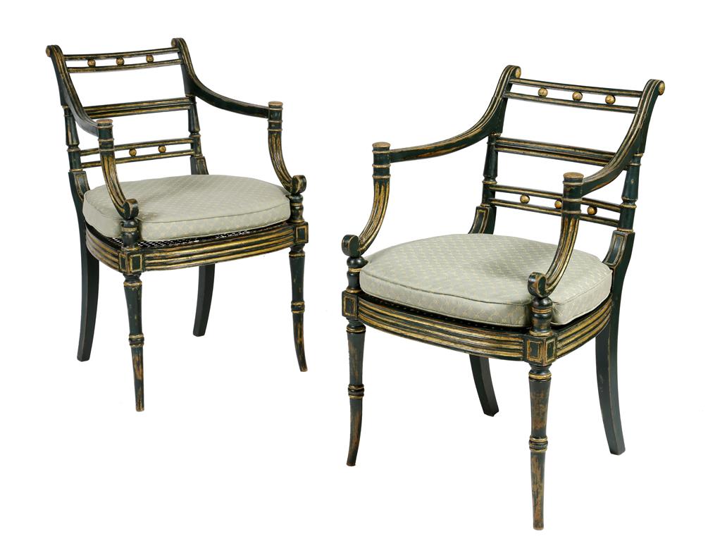 A pair of Regency style beechwood armchairs, with later green painted and parcel gilt decoration, each with ball applied horizontal splats, with scroll arms above a cane seat and ring turned tapering front legs, each with a squab cushion, the seat rail of one chair stamped 'G. S.'.(2)