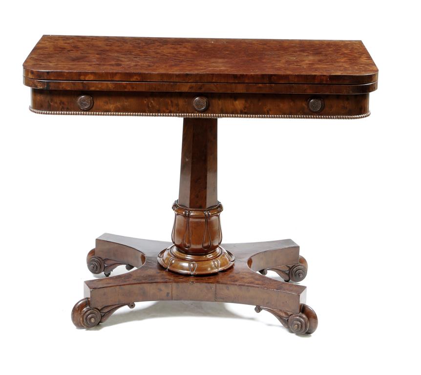 An early Victorian plum pudding mahogany card table