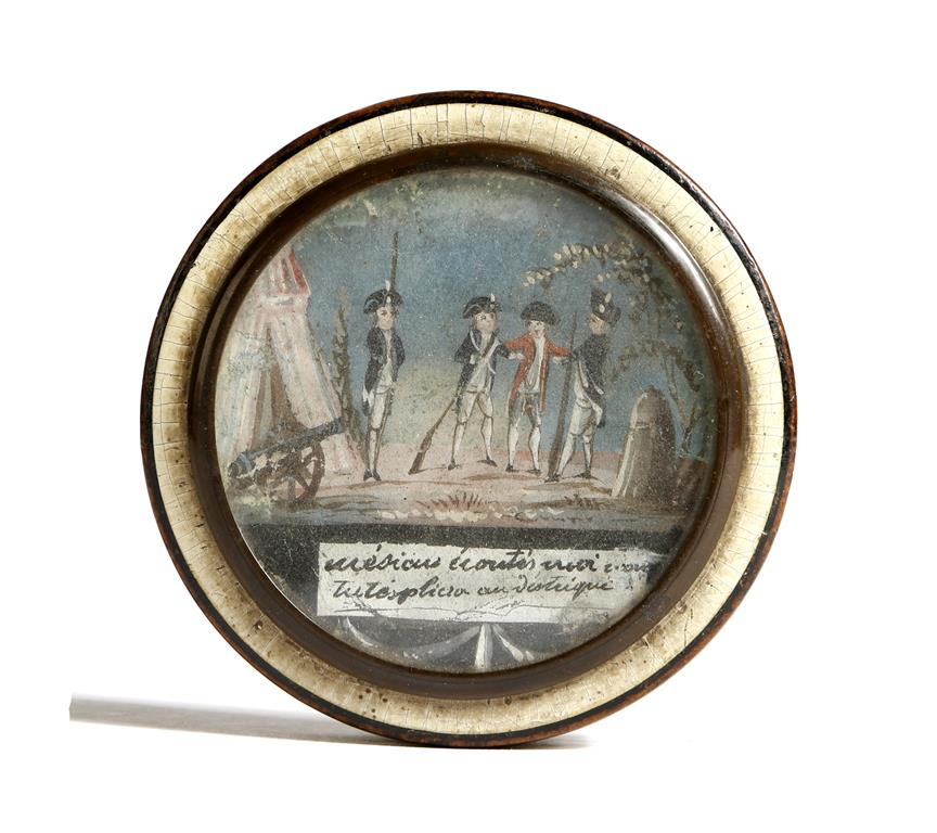An early 19th century French Napoleonic lacquered snuff box, the lid painted with soldiers at camp, indistinctly inscribed, with a faux tortoiseshell interior, the base with a paper label inscribed in pencil 'This box belonged to my paternal grandmother....(1850)....from France by her 2nd husband.....', 8.1cm diameter.