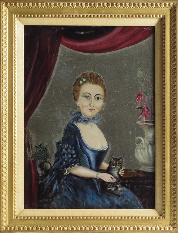 A pair of 19th century French mirrored reverse glass pictures of ladies, seated in interior scenes, one with her cat on her lap, the other holding a fan, 41.7 x 29.7cm, in later gilt frames. (2)