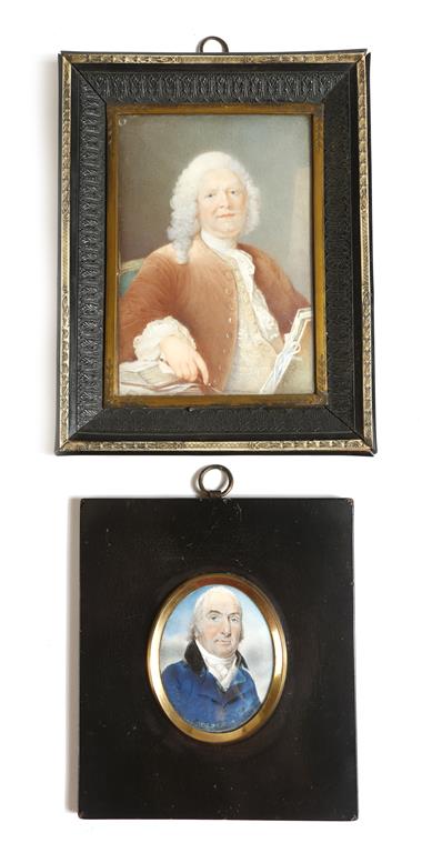 λ A French portrait miniature on ivory of a gentleman, signed indistinctly 'Pispre', in a gilt brass and moulded frame, late 19th century, together with a George III portrait miniature of a gentleman, the verso inscribed 'Wm Woodhouse, 1800 aged 42', in a gilt brass and ebonised frame, 18 x 13.8cm (max). (2)