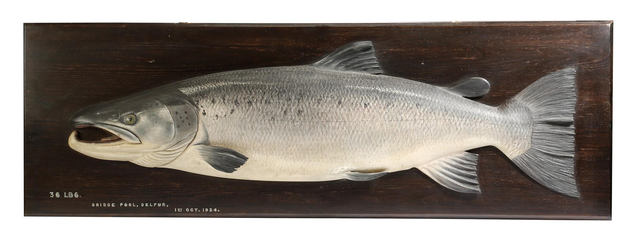 A George V carved wood and painted half-block model of a salmon attributed to the Fochabers Studio, mounted on a stained pine plaque and inscribed '36 LBS, BRIDGE POOL, DELFUR, 1ST OCT.1924.', 44.4 x 132cm, together with facsimile photographs of the fisherman who caught the salmon, in two frames. (3)