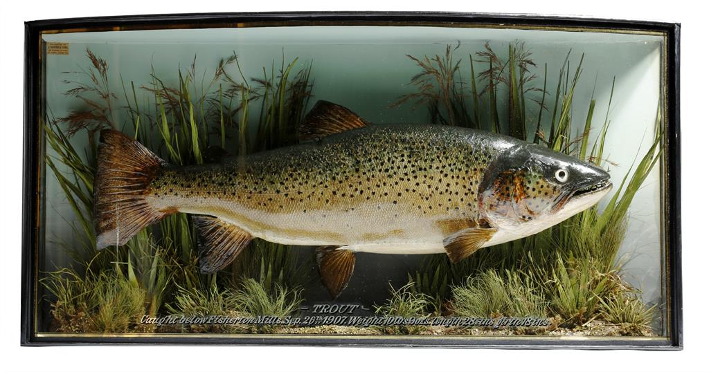 Taxidermy. An Edwardian preserved trout by J. Cooper & Sons, mounted in a naturalistic setting with a printed trade label inscribed 'PRESERVED BY J. COOPER & SONS, 28 Radnor Street, ST. LUKE'S, LONDON E. C.', in a glazed ebonised bowfront case with gilt lettering inscribed 'TROUT Caught below Fisherton Mills.Sep. 26th 1907. Weight 10lb's 9oz's. length 28 1/2in's. girth 18in's'., 44.3cm high, 89.4cm wide, 19.4cm deep, together with a framed facsimile photograph of the fisherman who caught the fish. (2)