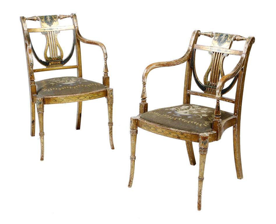 A pair of Regency style giltwood and painted child's armchairs, each with a lyre back and a drop-in needlework seat, one dated '1937', late 19th / early 20th century. (2)