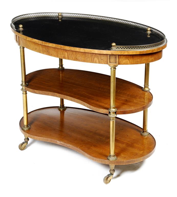 A mahogany drinks trolley, with a pierced brass gallery, with an ebonised oval top above two kidney shaped tiers, with brass column supports and castors, 20th century, 77cm high, 96.5cm wide, 56cm deep.