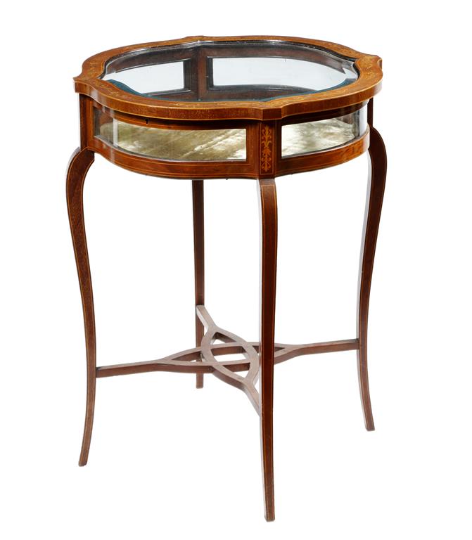 An Edwardian mahogany and marquetry bijouterie table, the hinged top with a bevelled glass panel and inlaid with scrolling leaves, on cabriole legs united by a stretcher, 75.8cm high, 60.8cm wide, 60.5cm deep.