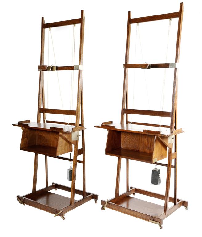 A pair of oak artist's easels by John F. Brooks, with nickel mounts, each with a weighted adjustable rest, on ceramic castors, 210cm high, 90.7cm wide, 56.3cm deep. (2)