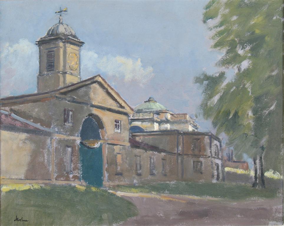 LORD PAUL METHUEN R.A. (1886-1974): Dodington, Gloucestershire, entrance and chapel, signed, oil on board, 43 x 54cm (17 x 21.25in) Exhibited: Royal Academy Summer Exhibition 1973
