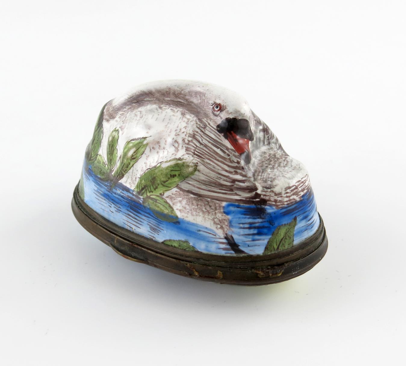 c.1760-70, modelled as a swan with its head resting over its back, swimming amidst aquatic reeds, the hinged oval cover painted with a further mute swan on a lake, 7.6cm across.