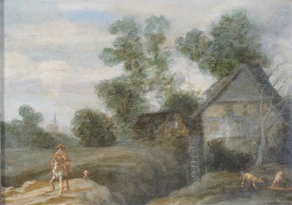 FOLLOWER OF PAULUS POTTER (Dutch 1625-1654): Figures and dogs in a landscape, oil on panel, 18 x 25.5cm (7 x 10in) ++ Fairly extensive restoration in sky.
