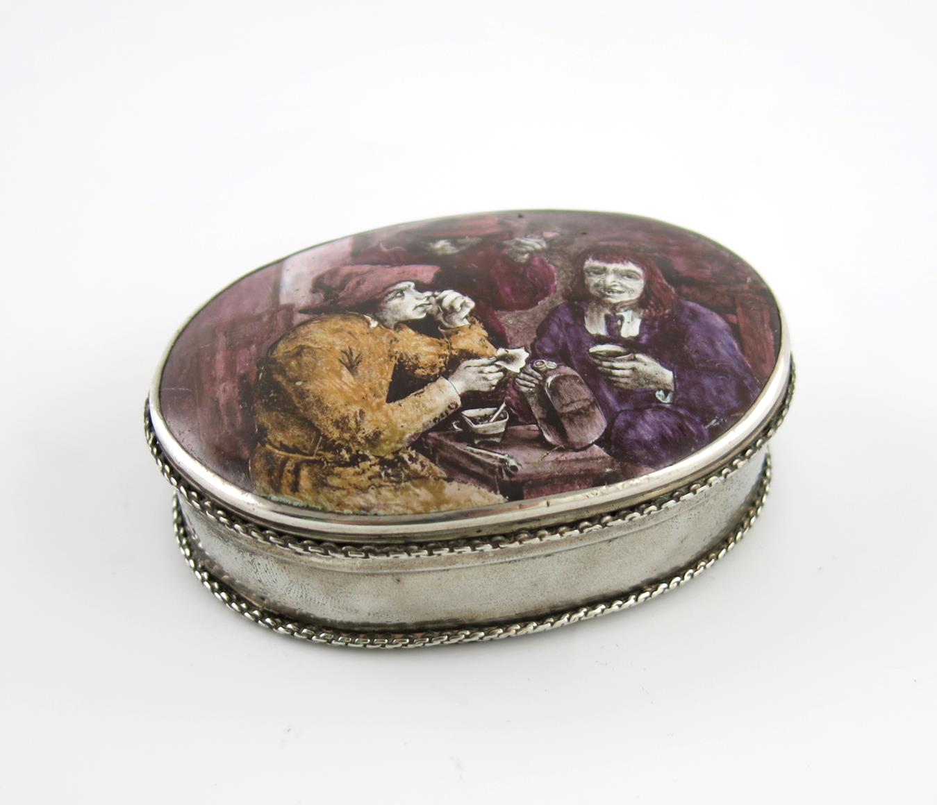 the cover set with an enamel plaque painted after David Teniers with a tavern scene of three men taking snuff, drinking and smoking a pipe, the sides with a narrow ropetwist border to the top and bottom, 9cm across.
