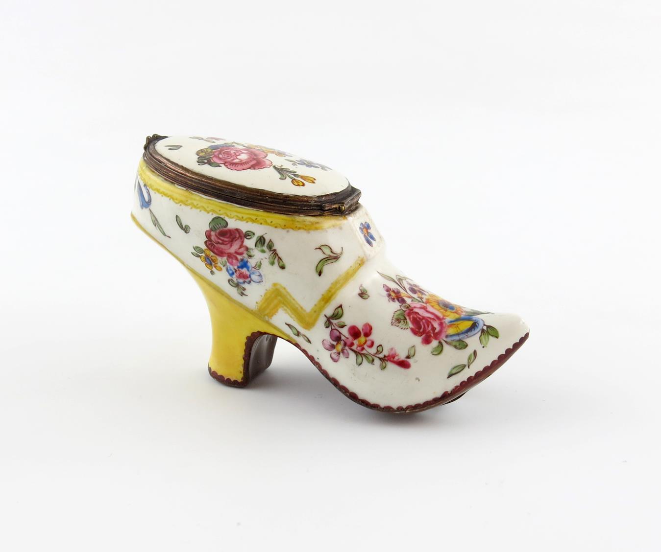c.1760-70, modelled as a lady's shoe, brightly painted with polychrome sprays of flowers, the heel and trim enamelled a rich yellow, the sole painted brown, 10cm long.