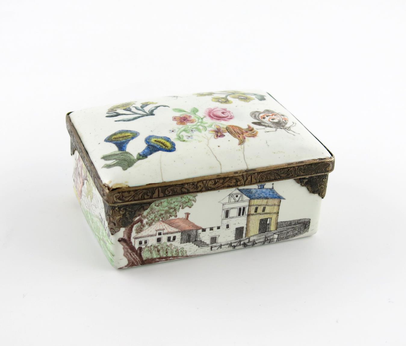 18th century, the sides finely painted with landscape scenes of buildings, one with a piper, the hinged lid with flowers and flying insects, the interior cover painted with the portrait of a lady leaning against a plinth, the silver mounts engraved with scrolling leaves, 8.5cm.