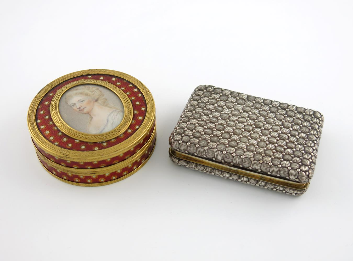 circular form, engraved borders, the pull-off cover with an oval portrait of a lady, with linear white, red and gold ground, tortoiseshell lined, diameter 8cm, plus a silver snuff box, of rectangular form, basket weave decoration, the inside of the hinged cover with a panel of a putto, goblet and urn, length 8.8cm. (2)