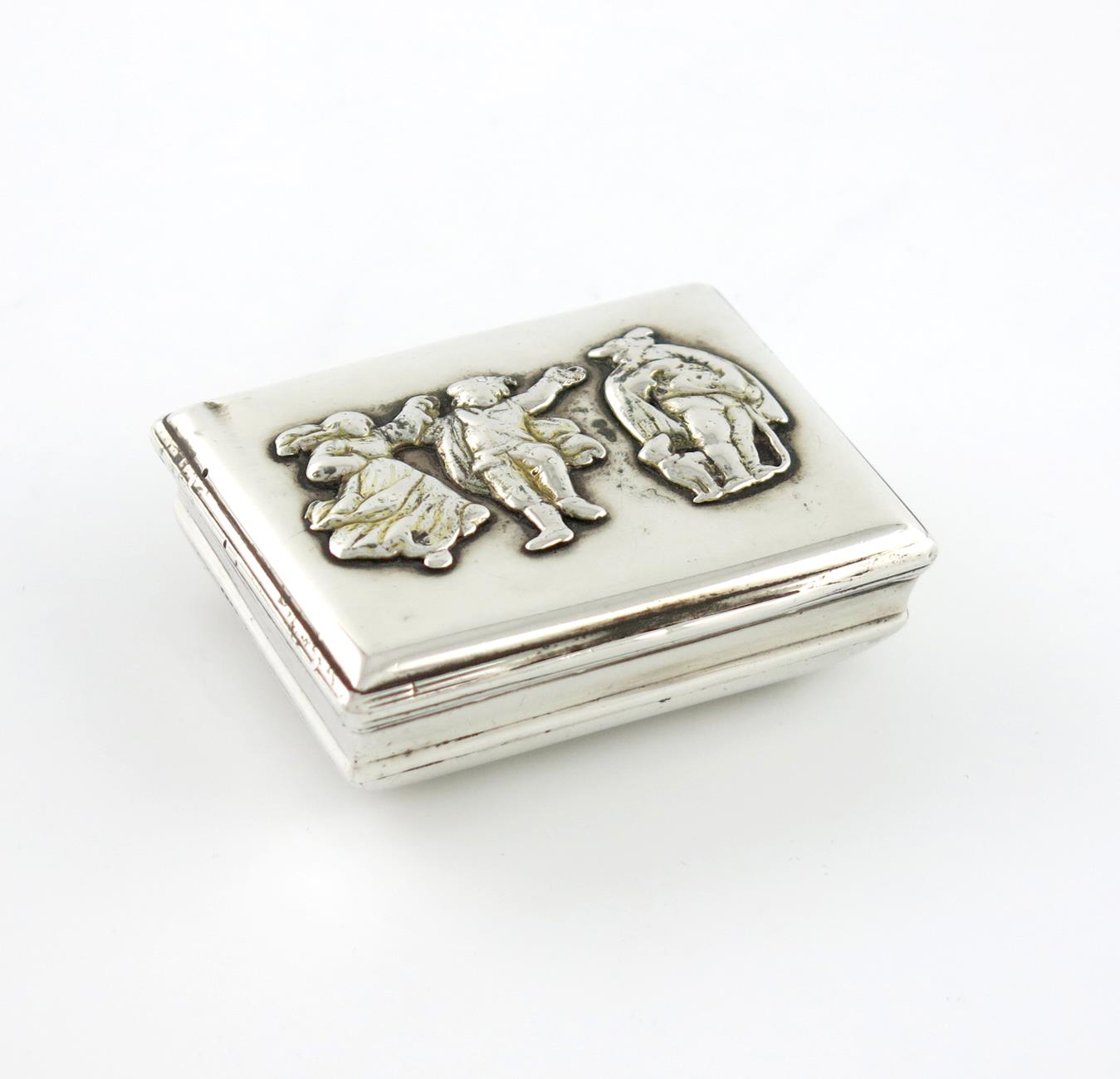 rectangular form, the hinged cover applied with three dancing figures, gilded interior, the inside of the hinged cover with a finely painted satirical plaque of a well-dressed lady smoking a long-stemmed clay pipe and wearing a cocked hat with a red ribbon cockade, a winged putto behind her wearing a similar hat and sash, writing on a piece of parchment the words 'Je n'énrôle que des volontaires', length 6.7cm.
