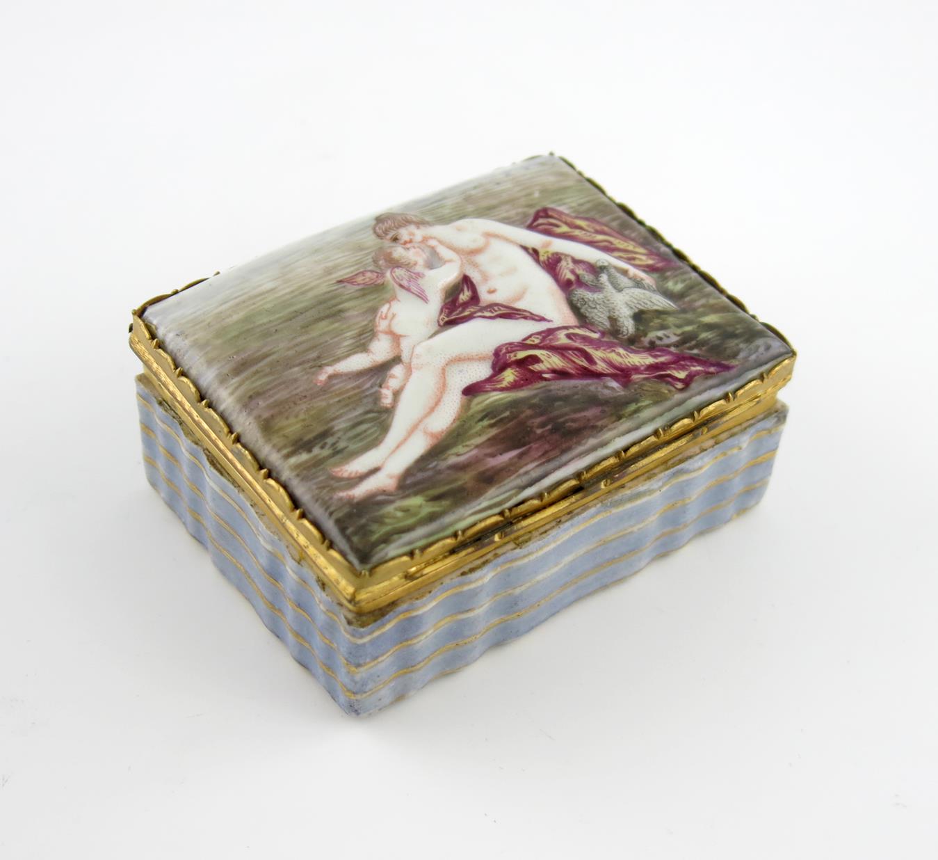probably 19th century, the cover with raised decoration of Cupid embracing Psyche, whose left hand reaches out to a pair of doves beside her, the sides and base with wave and shell moulding, decorated in a pale lilac with narrow gilt bands, with gilt metal mounts, 8.2cm across.