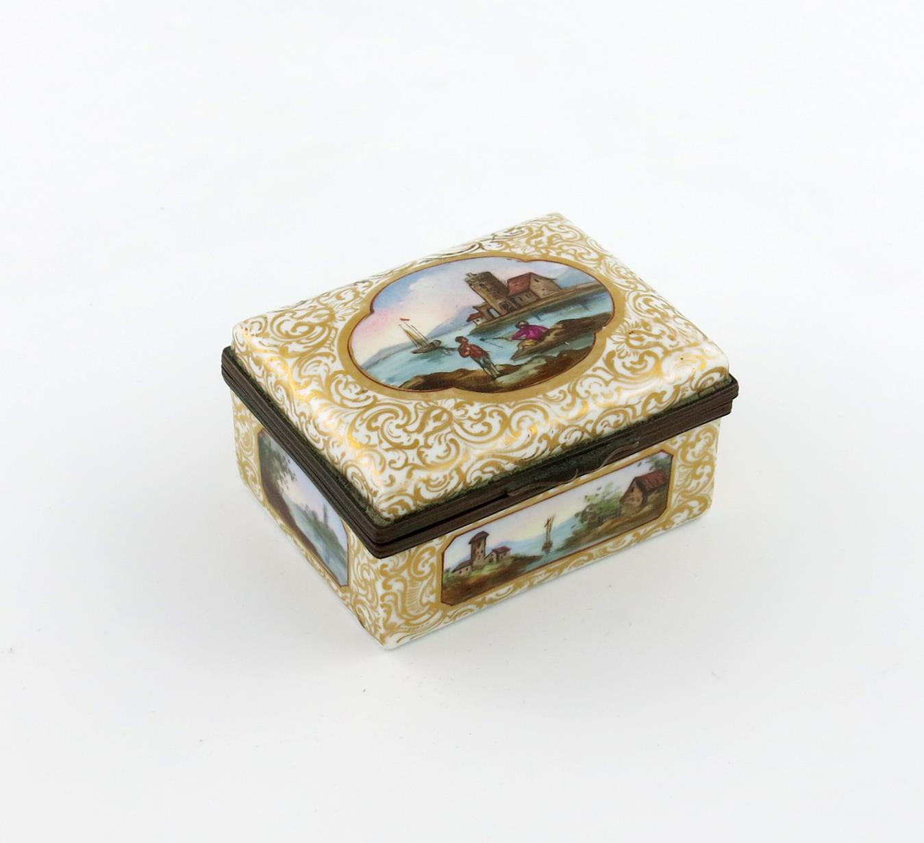 late 19th century, decorated in the Meissen manner, the cover with a quatrefoil cartouche of figures fishing in a harbour setting, reserved on a ground of gilt foliate scrolls, the sides with chamfered rectangular landscape panels, a landscape scene echoed to the interior, overglaze blue pseudo Sèvres mark to the base, 8.3cm.