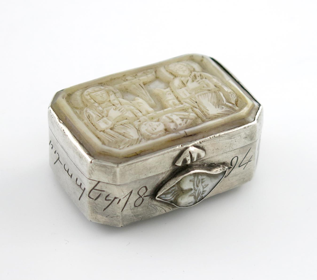 rectangular form, canted corners, the hinged cover and base with nativity scenes, the front with a flaming heart motif, inscribed and dated '1894', length 5.3cm.